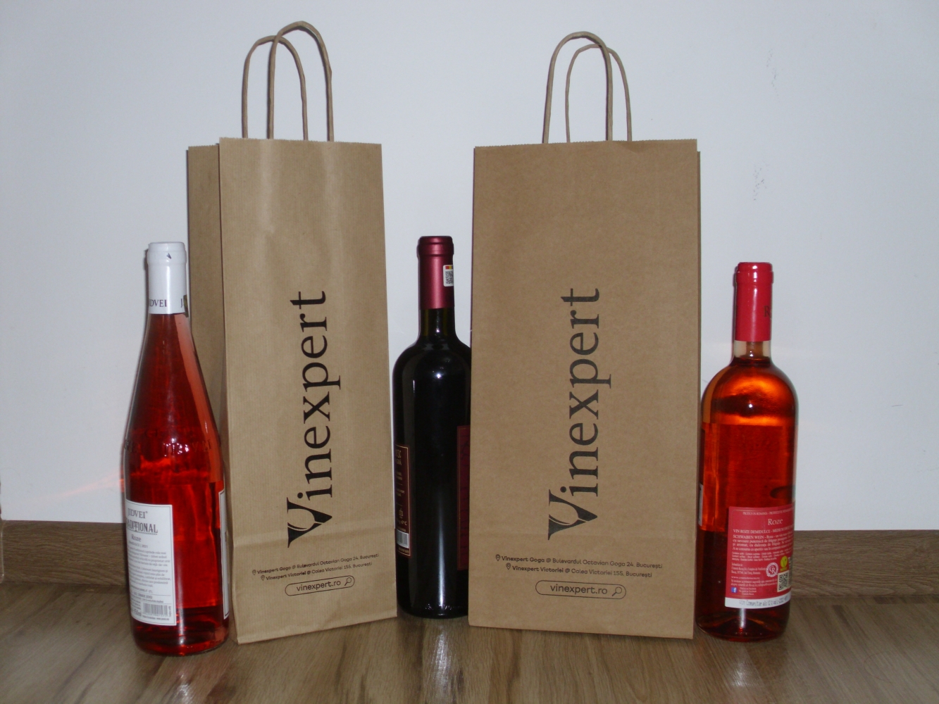 Pungă hârtie kraft pentru două sticle. Mânerul este din hârtie răsucită, întărit la interior – 18x8x39 cm